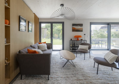 Cette villa se distingue donc par sa structure en bois, son isolation écologique en paille et en laine de bois, ainsi que par l’utilisation de matériaux de finition naturels tels que la terre crue et la chaux. Conçue dans une optique de durabilité et de respect de l’environnement, cette construction allie confort, esthétisme et performance énergétique.